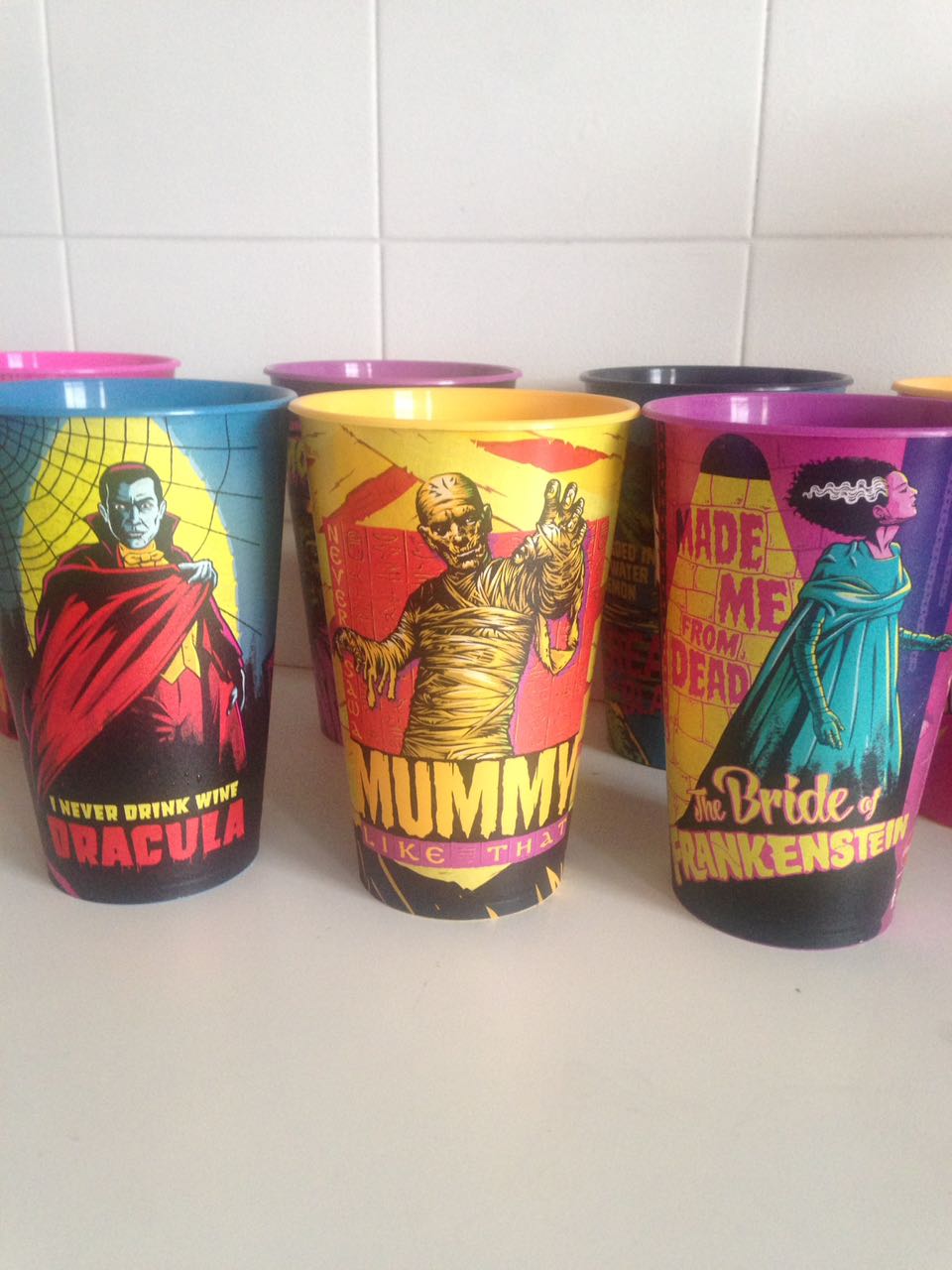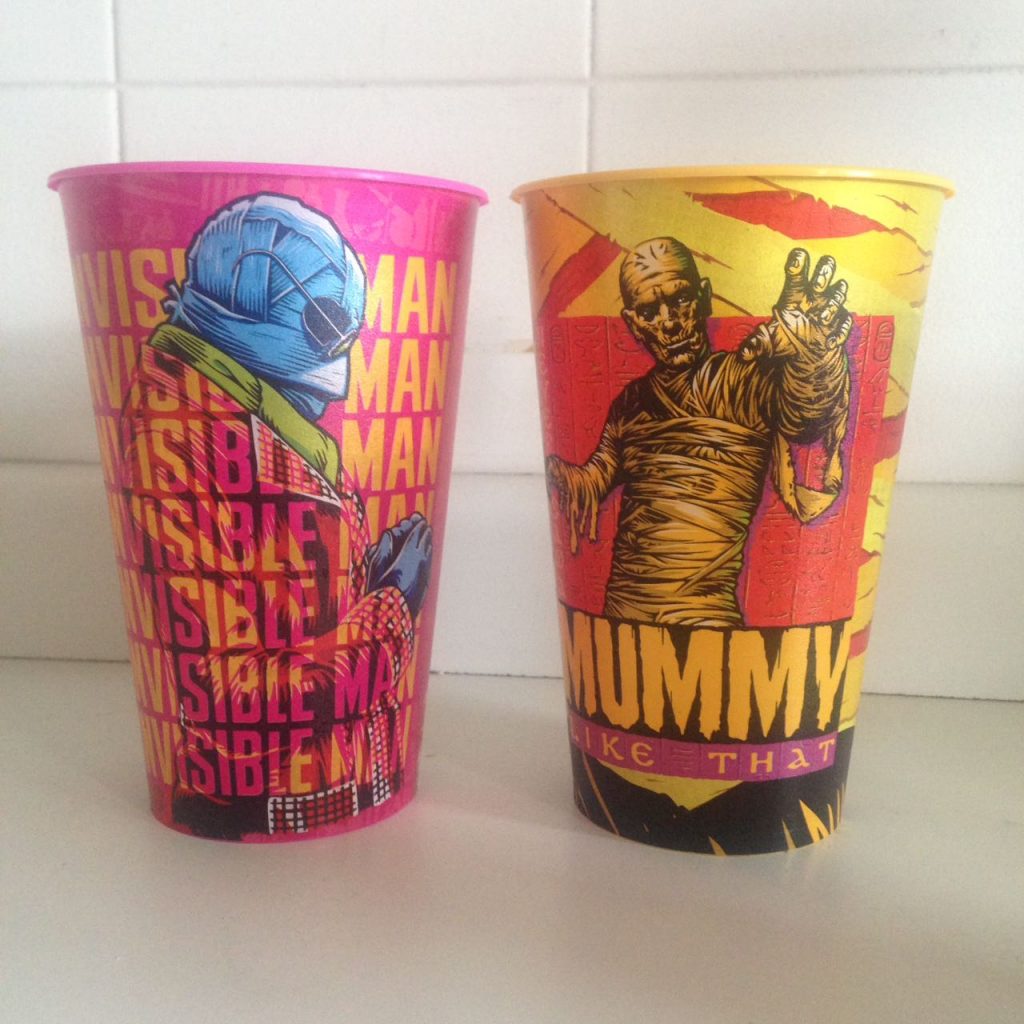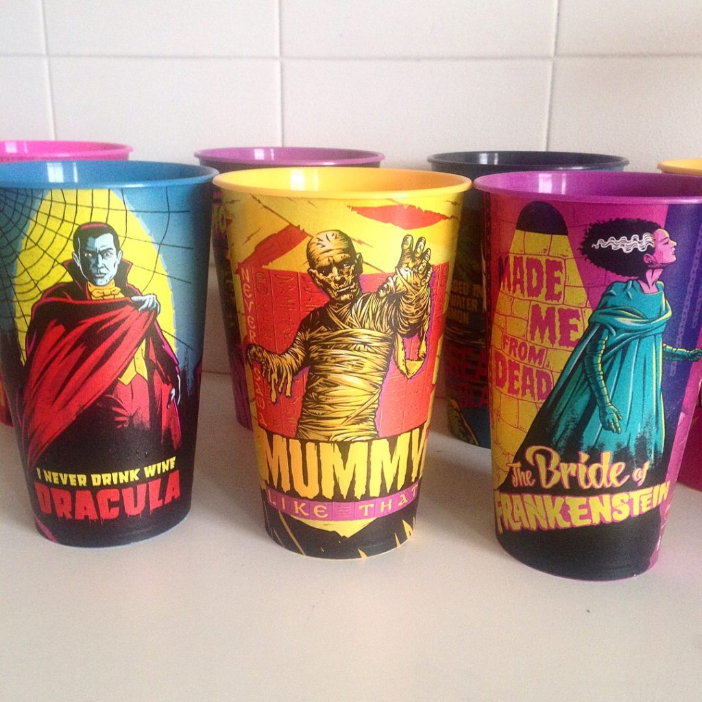 Os personagens escolhidos para a parceria foram a Múmia, o Monstro da Lagoa Negra, o Homem Invisível, o Lobisomem, Drácula, Frankenstein e a Noiva do Frankenstein. Os copos mostram ilustrações mais coloridas e cartunescas, fugindo do tom que a Universal apresentou nessa nova leva de filmes. Também há referencias aos pôsteres clássicos.