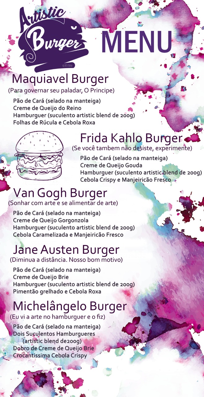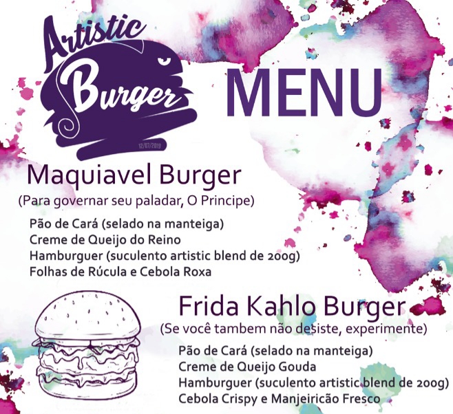 Criado em 2018 por Lucas Gandra Amorim, o Artistic Burger traz o conceito de união entre a Arte e a Gastronomia, duas das paixões do fundador. Os hamburgeres tem nomes que homenageiam grandes artistas de diversas áreas, como pintores, escultores e escritores. A proposta do restaurante é apresentar um lanche saboroso, único e especial, com foco em cremes de queijo diferenciados e uso de produtos de alta qualidade.