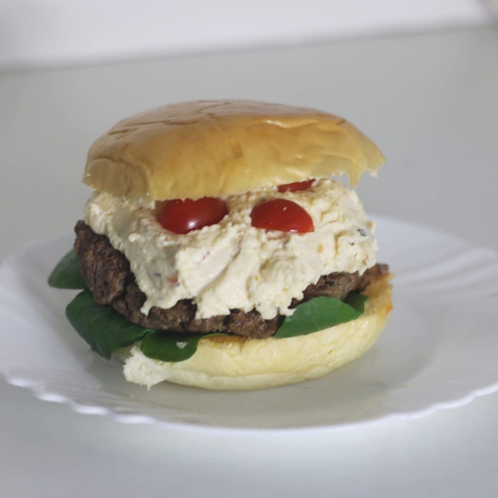 Jane Austen Burger – Hamburger de 200g, pão de cará selado na manteiga, creme de queijo brie, pimentão grelhado e cebola roxa