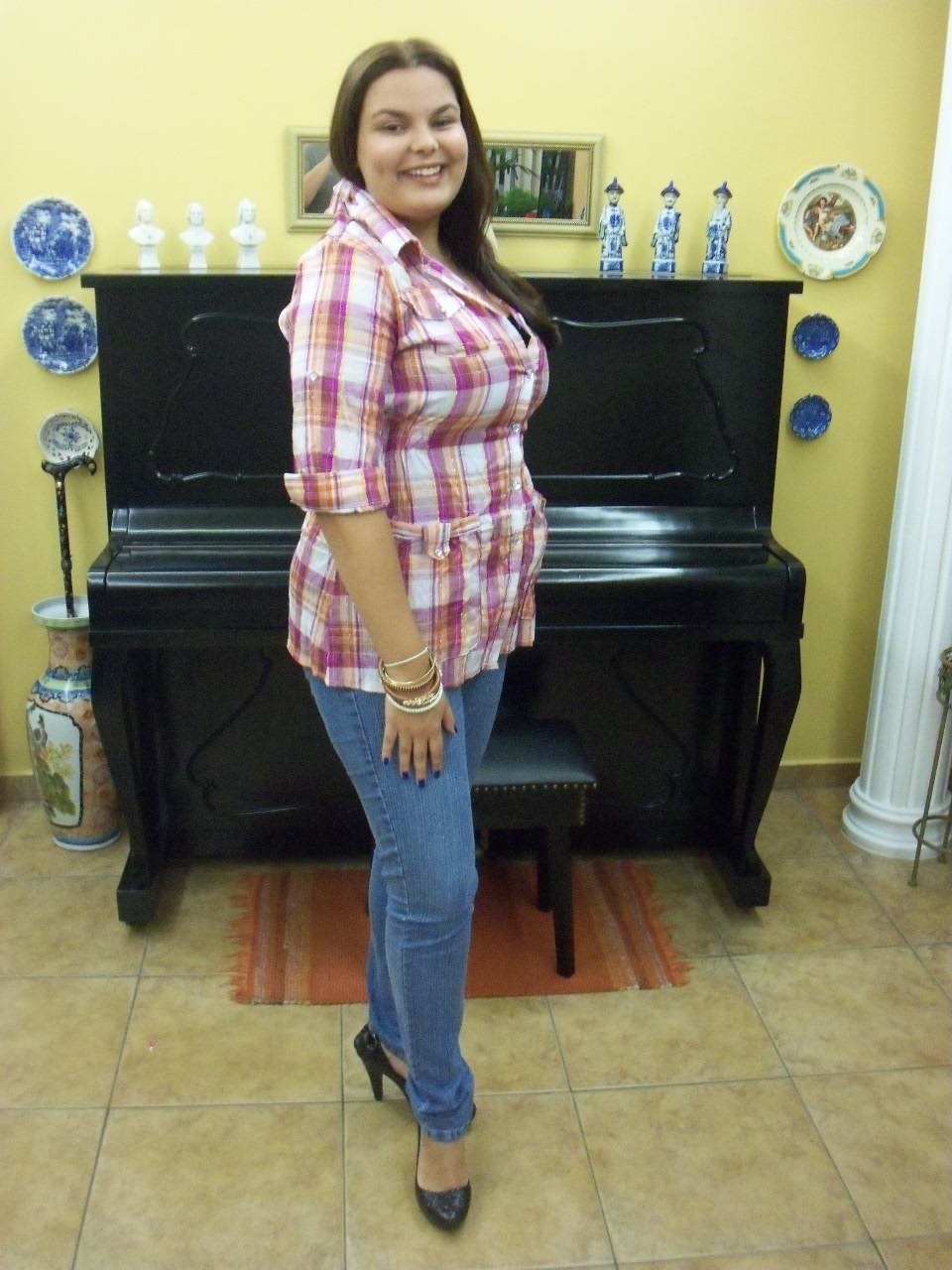 Já tinha experimentado esse modelo uma vez e achei ele um dos mais lindos dessa coleção. Essa aposta em escarpins que a marca vem apresentando é uma ótima maneira de reinventar o que as consumidoras geralmente usam. Um bom salto para festas e eventos sociais deixando o look chique e com mais seriedade. É confortável apesar de ser um salto de 7 cm, e por ser um sapato preto combina com muita coisa. Eu optei por usa-lo inicialmente com duas camisas xadrez pois estamos em época de festas juninas. Gostei bastante do resultado com ambas, olha só:
